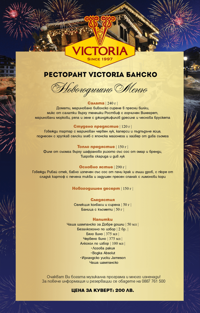 Знаете добре как още не сме си разопаковали багажа от морската ни почивка и вече започваме да се чудим къде и как да посрещнем Нова година. Зимният сезон ни предлага множество варианти, като най-популярните са три: да празнуваме в домашна обстановка, да наемем къща за гости или да съчетаем повода с ваканция в планината и белите писти. Последният е особено примамлив, тъй като българските курорти предлагат все по-добри условия за ски и сноуборд с атрактивни оферти за дневни карти за лифтовете и за нощувки, така че защо не посрещнем новогодишната нощ заедно в един от най-посещаваните ресторанти в Банско, какъвто несъмнено е този на VICTORIA?